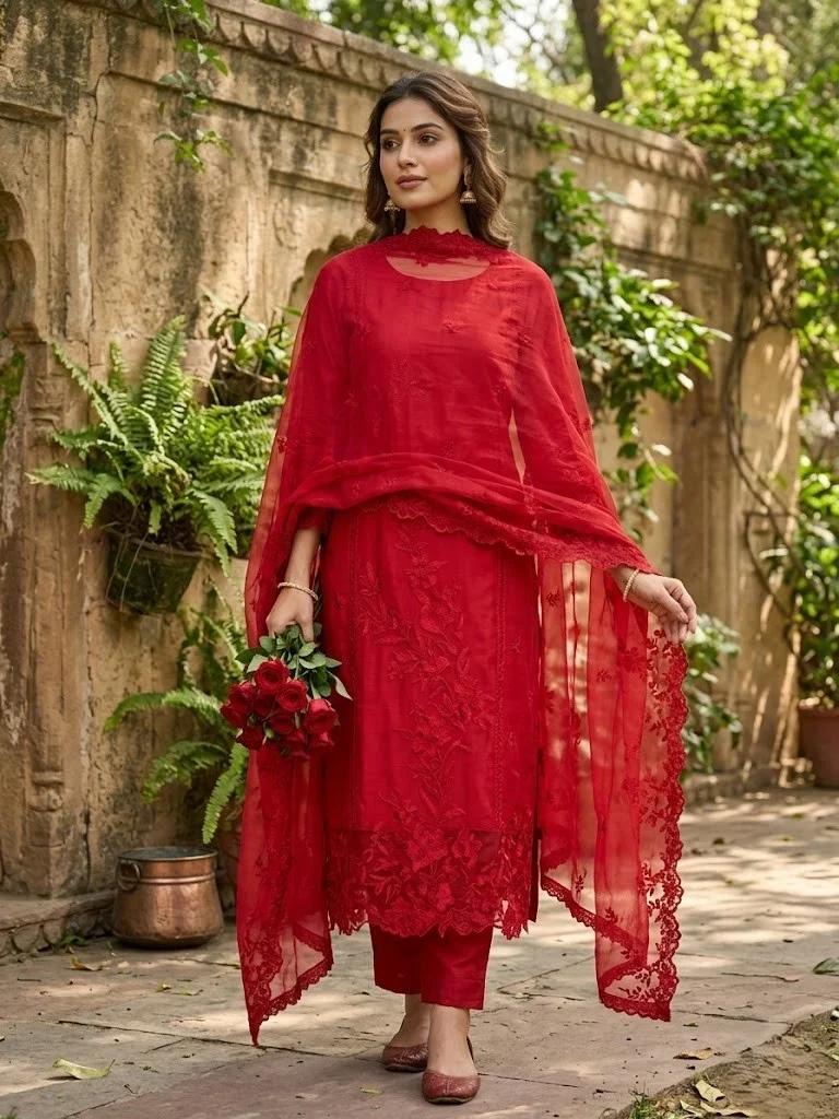 A rich crimson red ensemble designed with refined tone-on-tone embroidery for a luxurious and sophisticated look.