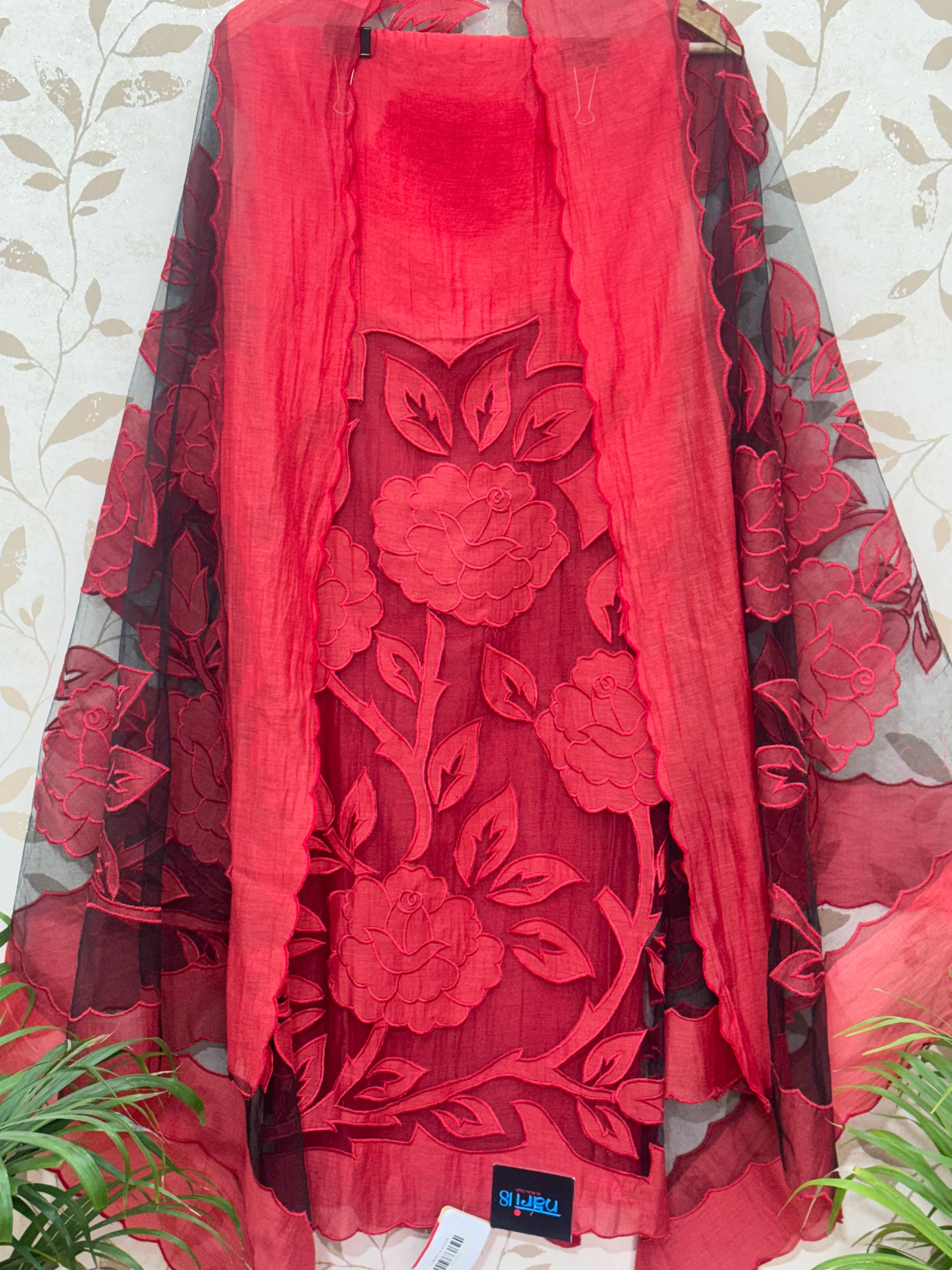 A bold and elegant deep wine red ensemble featuring striking floral embroidery for a rich and graceful festive look.