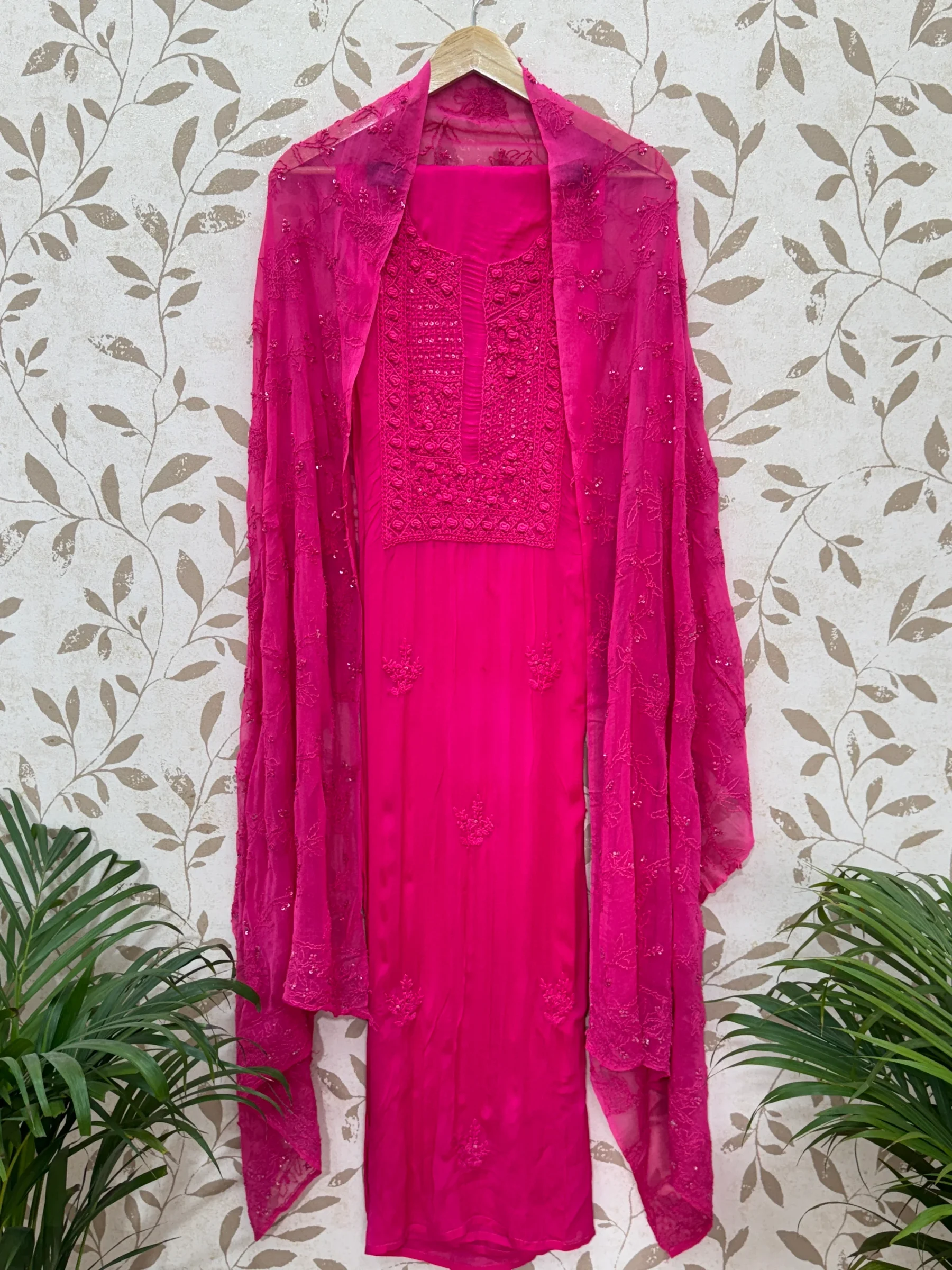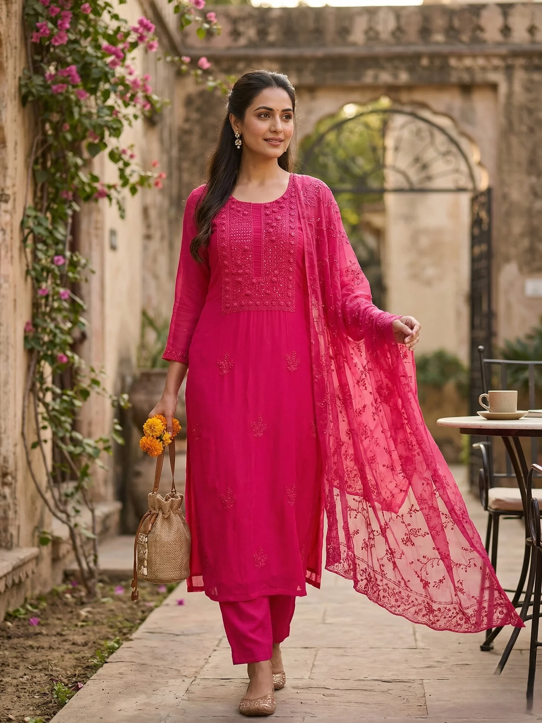 A refreshing pink monochrome ensemble designed with soft tonal embroidery for a graceful and elegant look.