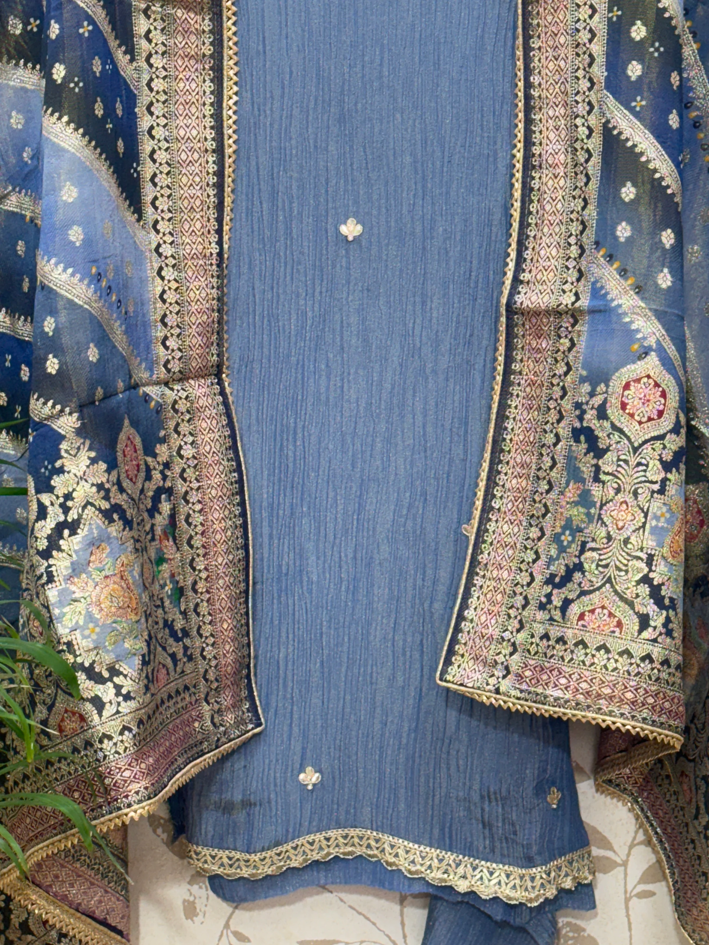 A regal steel blue ensemble paired with a rich Banarasi silk dupatta, designed for luxurious festive and occasion wear.