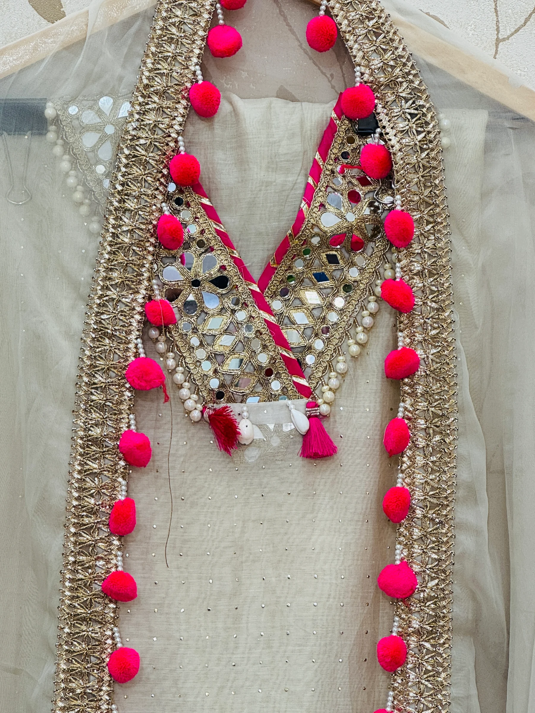 An elegant ivory ensemble featuring delicate mirror work and playful pom-pom detailing, perfect for festive and celebratory occasions.