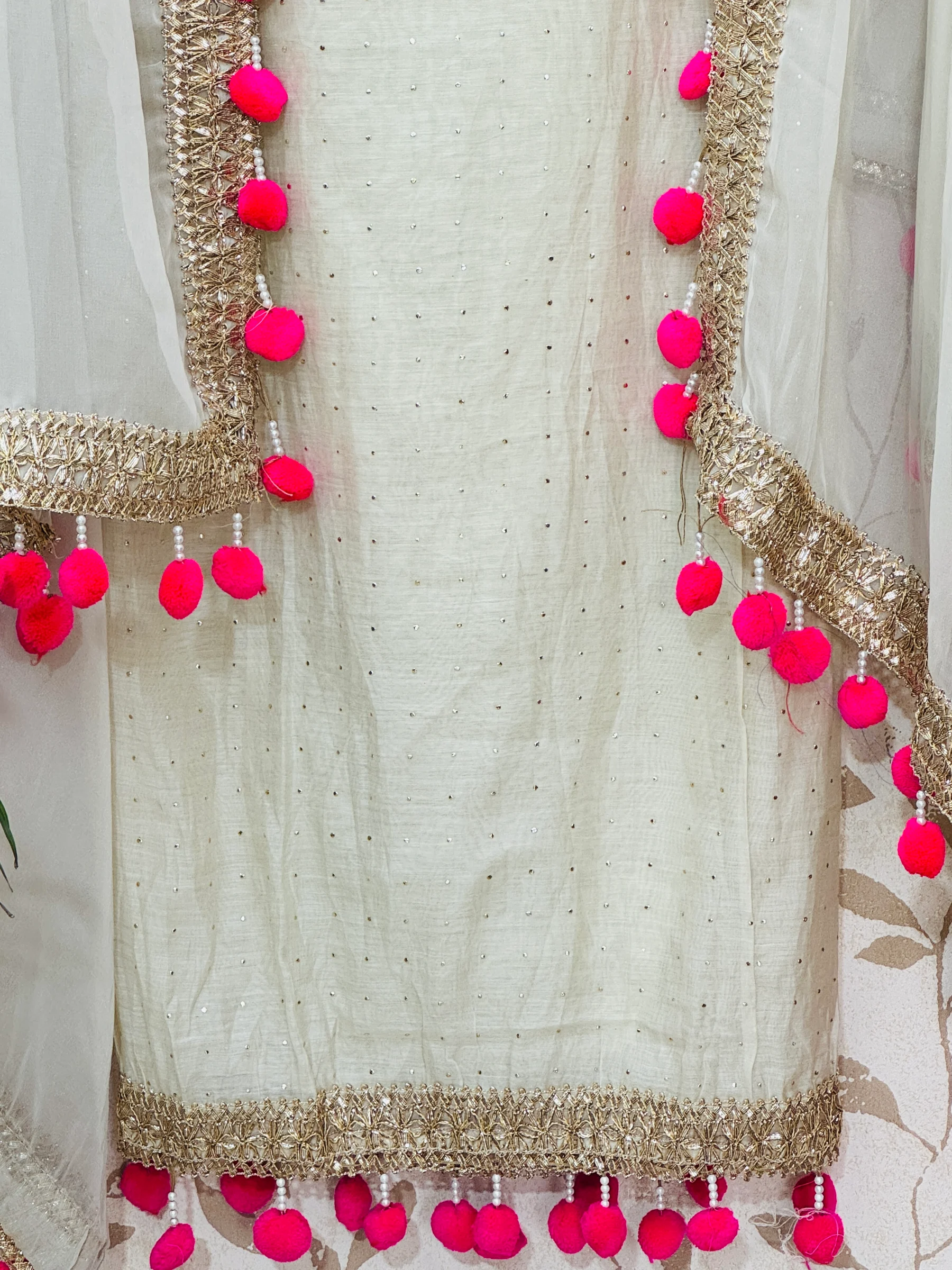 Ivory Embellished Suit Set with Pom-Pom Dupatta