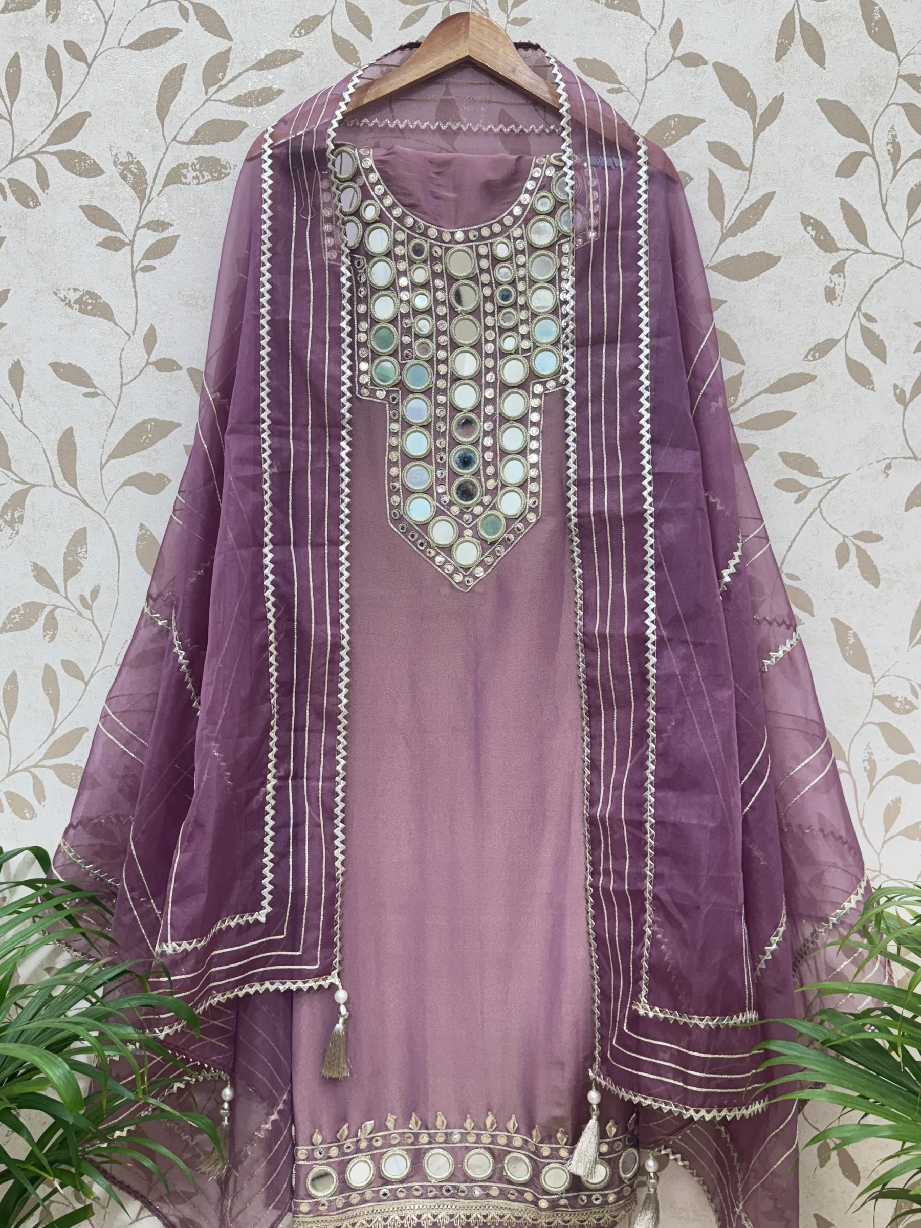 A refined mauve ensemble crafted for understated luxury, featuring intricate mirror work and elegant festive detailing.