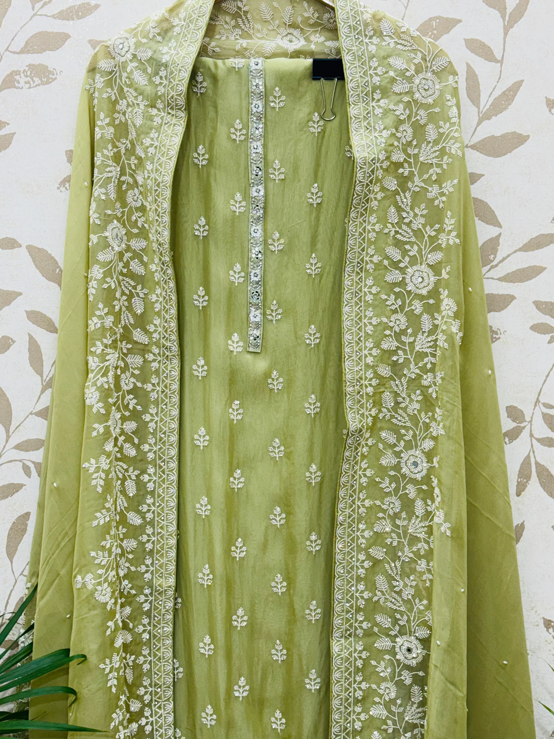 A graceful olive green ensemble designed with delicate embroidery and soft textures for an elegant, refined look.