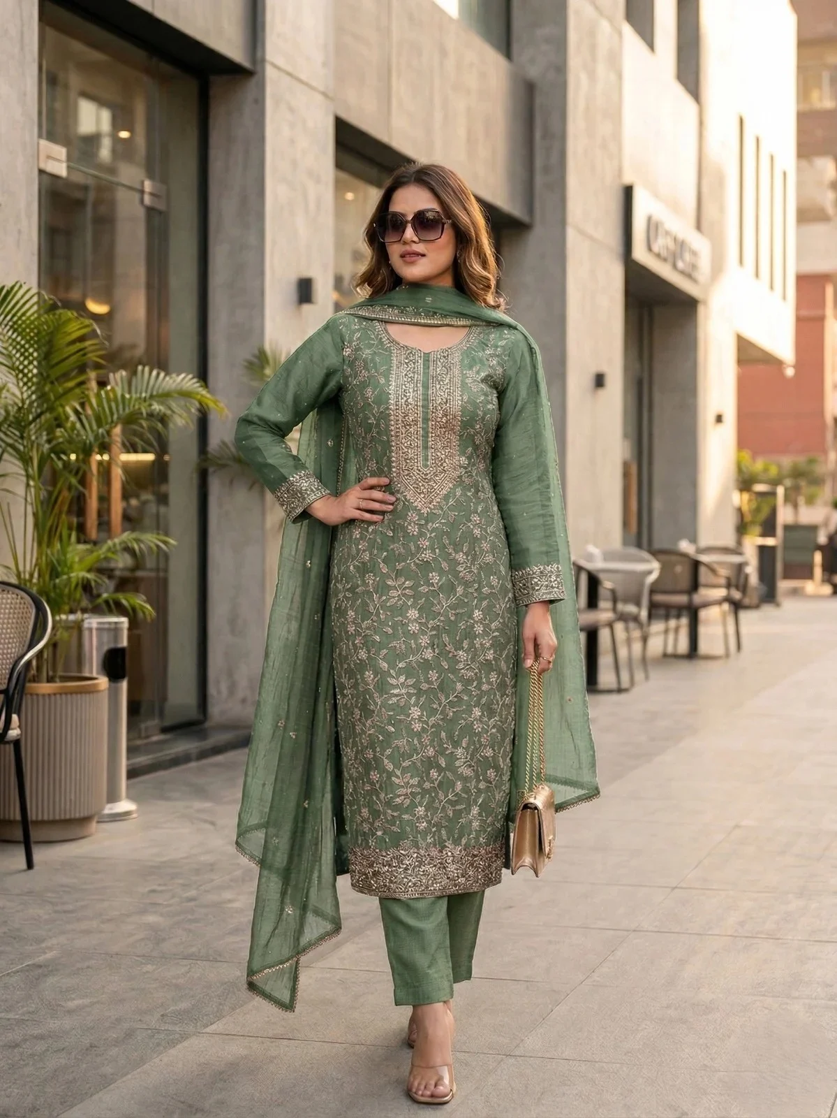 A rich and graceful ensemble in pista green, adorned with antique gold zari work for a timeless festive appeal.