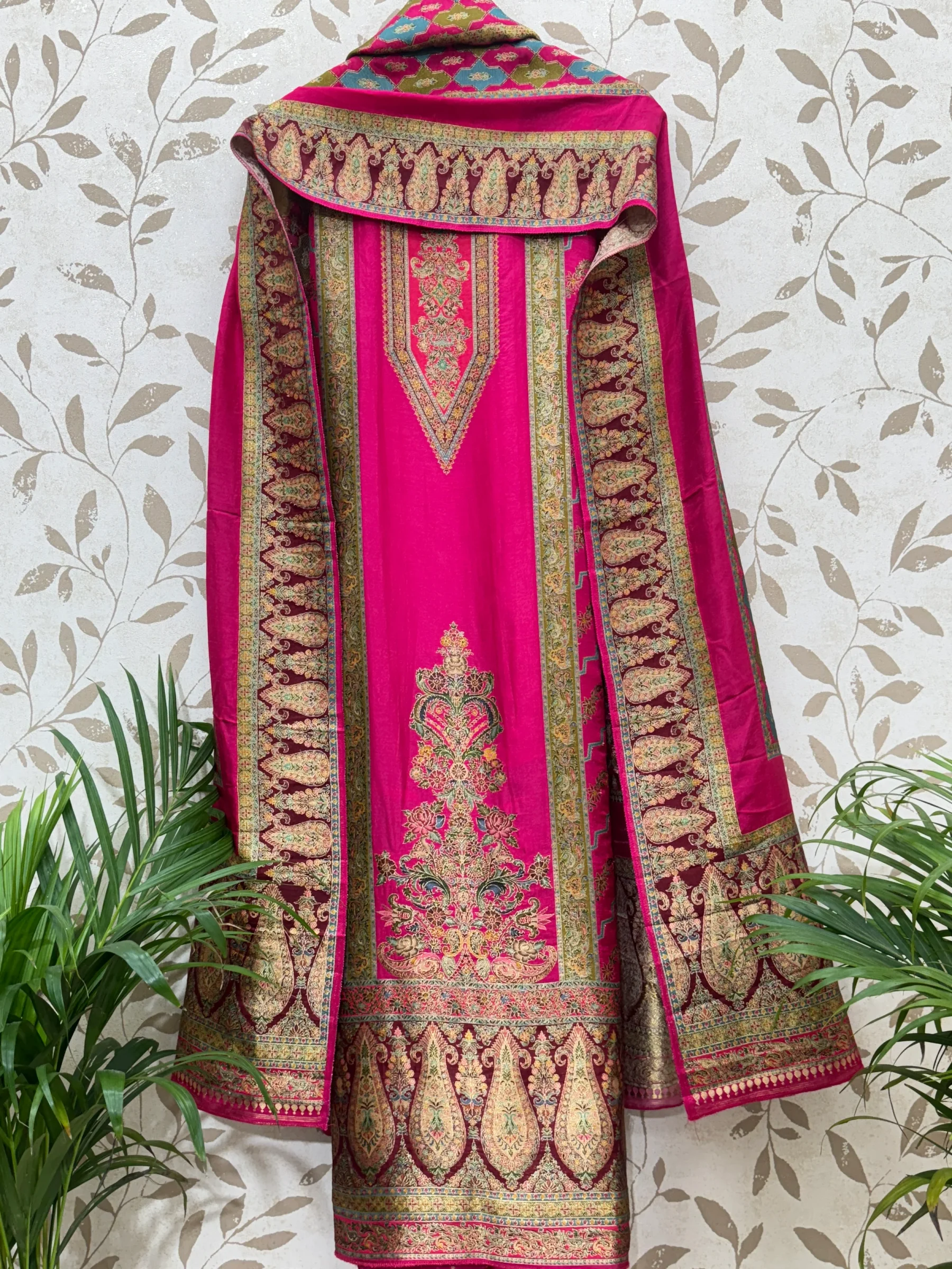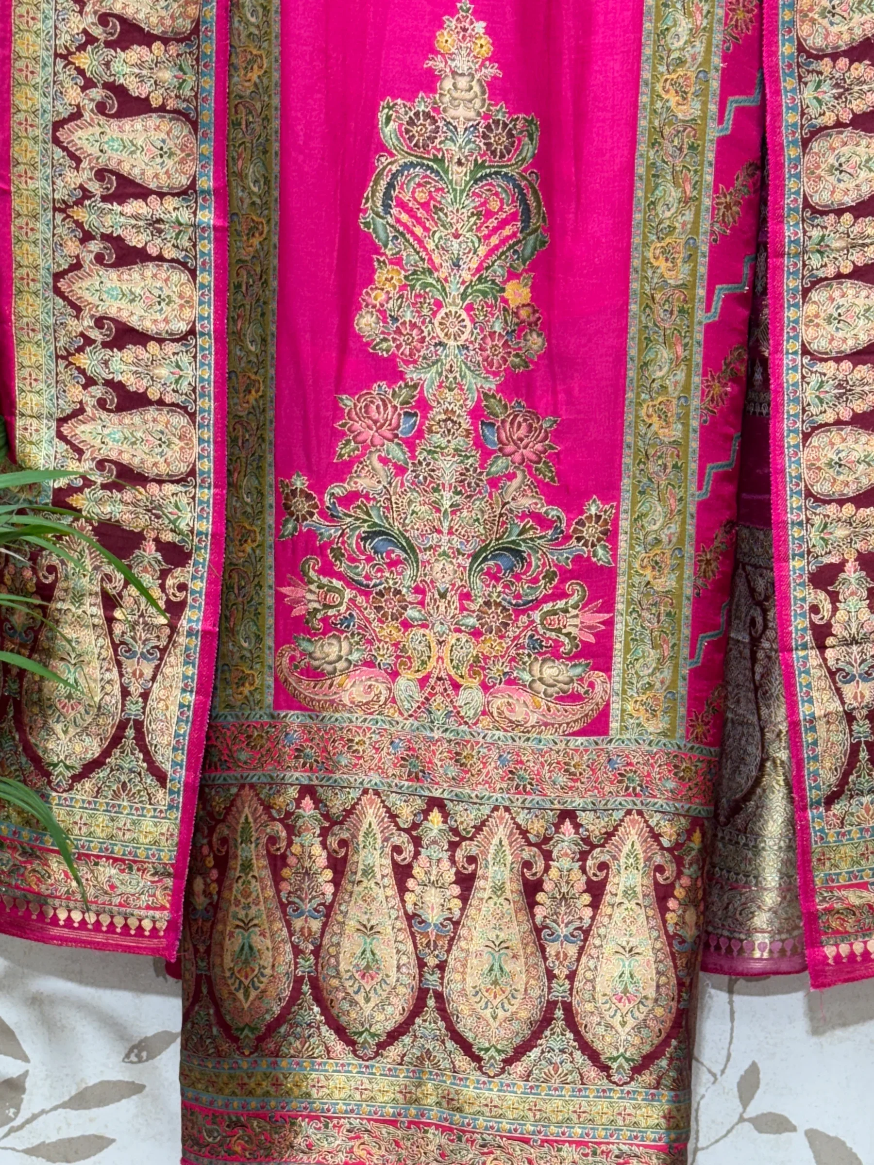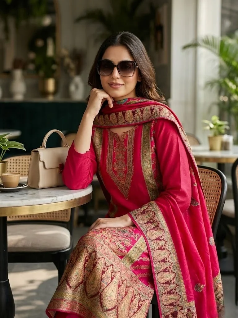 A striking royal magenta ensemble enriched with Kashmiri-inspired motifs and ornate detailing for a regal festive look.