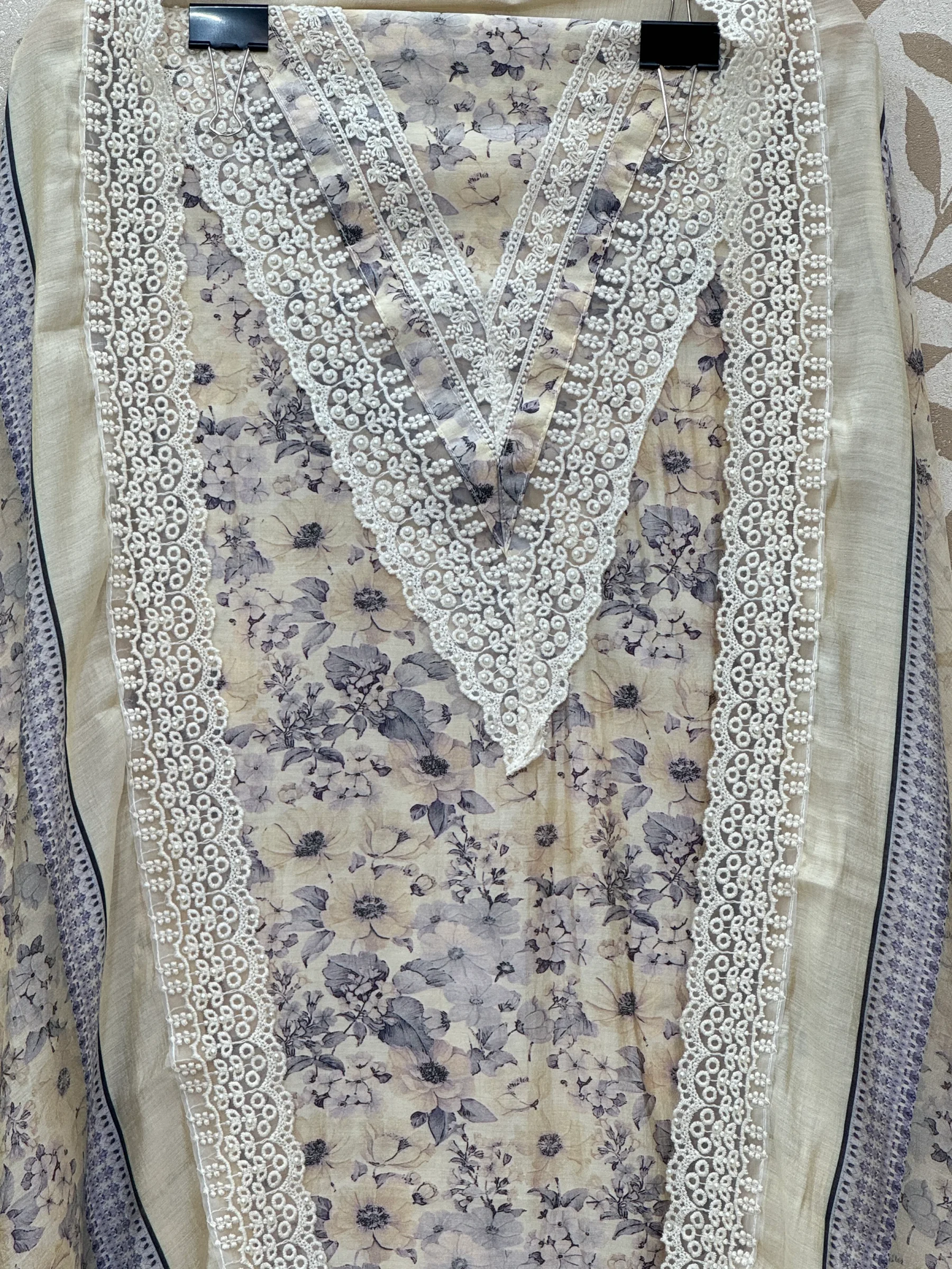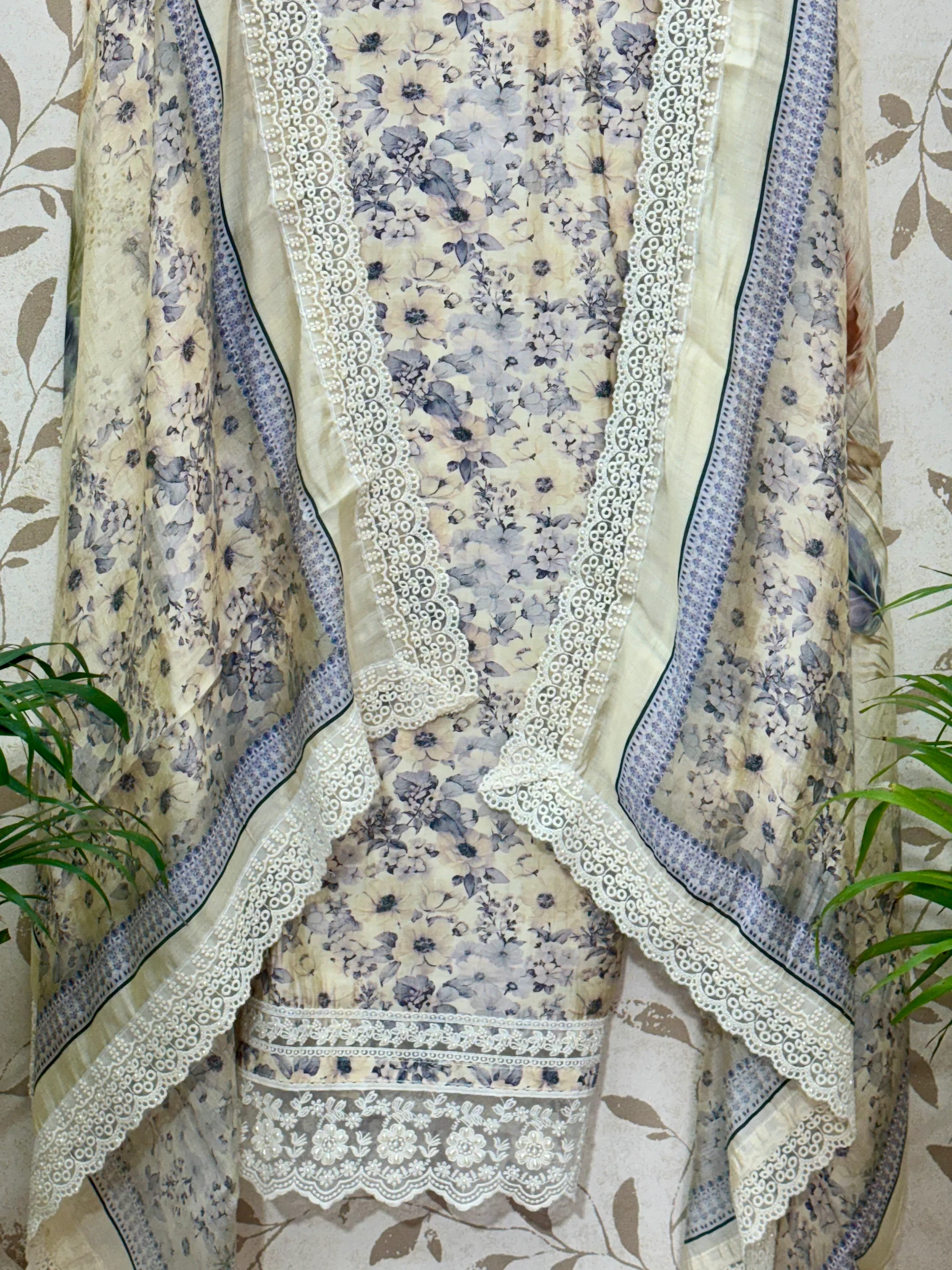 A soft ivory-beige floral ensemble with delicate lace detailing, designed for a graceful and feminine summer look.
